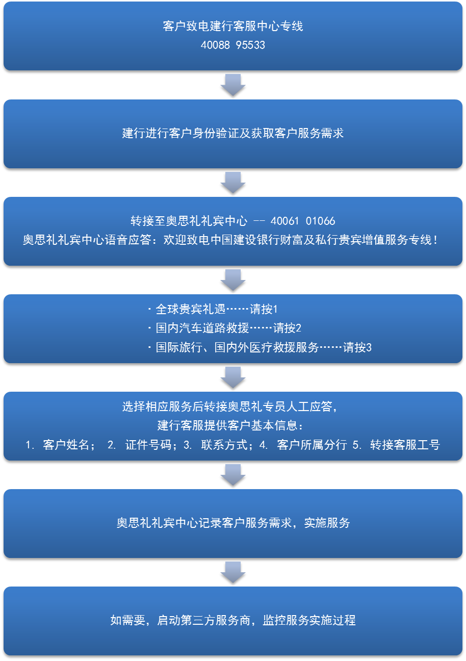 中国建设银行与上海思奥思救援服务有限公司合作面向高端客户推出国际SOS服务,(更名为全球礼遇服务),升级的服务内容新增了国内免费汽车道路救援服务,国际贵宾礼遇服务(签证申请、全球机场贵宾服务、酒店推荐及预订、留学礼遇等服务)。当客户在异乡遇到突发事件需要帮助,可以随时随地拨打全球礼遇服务专线寻求帮助,届时将有专业人员和医生提供24小时的高品质服务,为客户的国际行程保驾护航。