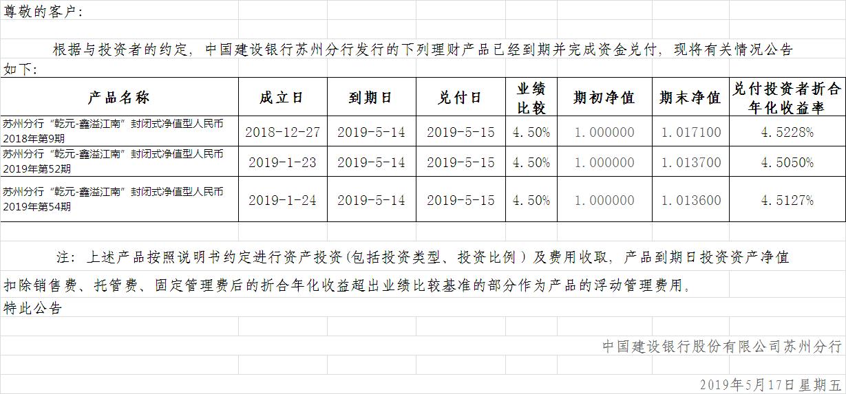 中国建设银行理财产品终止及清算公告